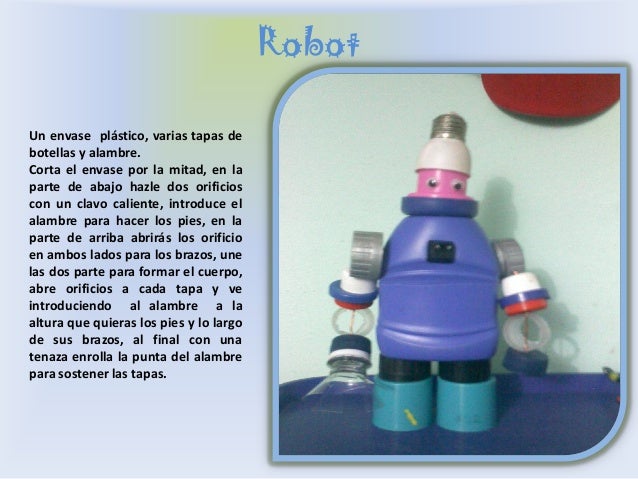 - a. Robot Un envase plástico, varias tapas de botellas y alambre. Corta el envase por la mitad, en la parte de abajo hazle dos orificios con un clavo caliente, introduce el alambre para hacer los pies, en la parte de arriba abrirás los orificio en ambos lados para los brazos, une las dos parte para formar el cuerpo, abre orificios a cada tapa y ve introduciendo al alambre a la altura que quieras los pies y lo largo de sus brazos, al final con una tenaza enrolla la punta del alambre para sostener las tapas.