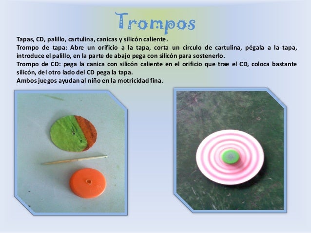 - b. Trompos Tapas, CD, palillo, cartulina, canicas y silicón caliente. Trompo de tapa: Abre un orificio a la tapa, corta un circulo de cartulina, pégala a la tapa, introduce el palillo, en la parte de abajo pega con silicón para sostenerlo. Trompo de CD: pega la canica con silicón caliente en el orificio que trae el CD, coloca bastante silicón, del otro lado del CD pega la tapa. Ambos juegos ayudan al niño en la motricidad fina.