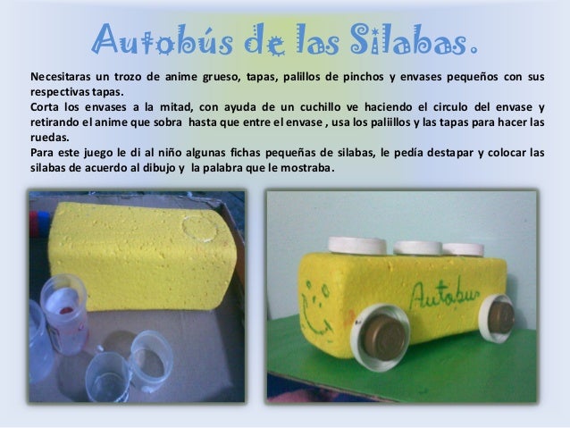 - c Autobús de las Silabas. Necesitaras un trozo de anime grueso, tapas, palillos de pinchos y envases pequeños con sus respectivas tapas. Corta los envases a la mitad, con ayuda de un cuchillo ve haciendo el circulo del envase y retirando el anime que sobra hasta que entre el envase , usa los paliillos y las tapas para hacer las ruedas. Para este juego le di al niño algunas fichas pequeñas de silabas, le pedía destapar y colocar las silabas de acuerdo al dibujo y la palabra que le mostraba.