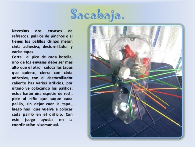 - d. Sacabaja. Necesitas dos envases de refrescos, palillos de pinchos o si tienes los palillos chinos mejor, cinta adhesiva, destornillador y varias tapas. Corta el pico de cada botella, uno de los envases debe ser mas alto que el otro, coloca las tapas que quieras, cierra con cinta adhesiva, con el destornillador caliente has varios orificios, por último ve colocando los palillos, estos harán una especie de red , pide al niño que saque cada palillo, sin dejar caer la tapa., luego has que vuelva a colocar cada palillo en el orificio. Con este juego ayudas en la coordinación visomanual.