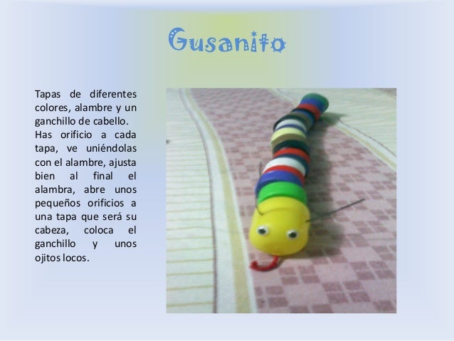 - e. Gusanito Tapas de diferentes colores, alambre y un ganchillo de cabello. Has orificio a cada tapa, ve uniéndolas con el alambre, ajusta bien al final el alambra, abre unos pequeños orificios a una tapa que será su cabeza, coloca el ganchillo y unos ojitos locos